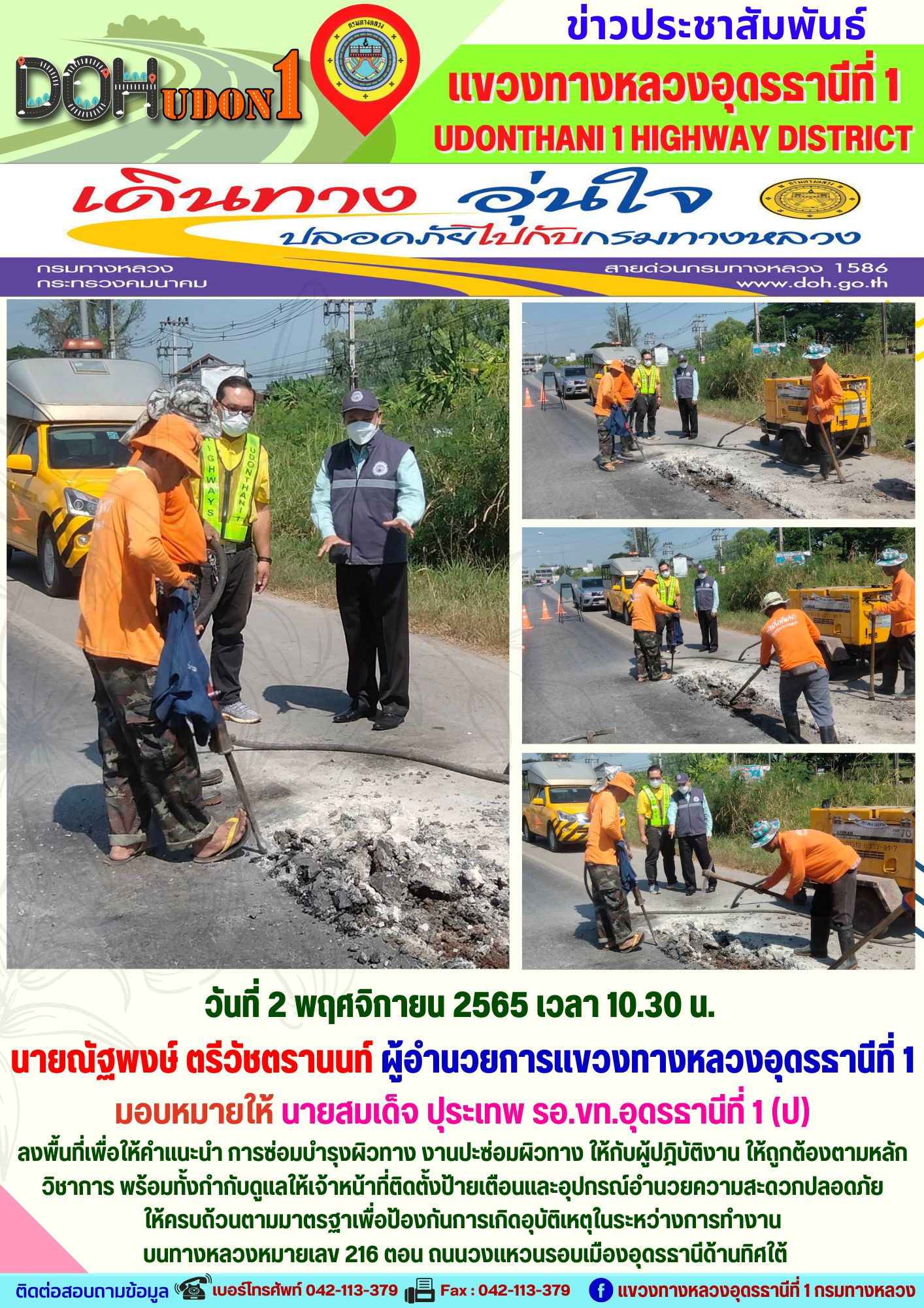 นายณัฐพงษ์ ตรีวัชตรานนท์ ผู้อำนวยการแขวงทางหลวงอุดรธานีที่ 1 มอบหมายให้ นายสมเด็จ ปุระเทพ รอ.ขท.อุดรธานีที่ 1 (ป)