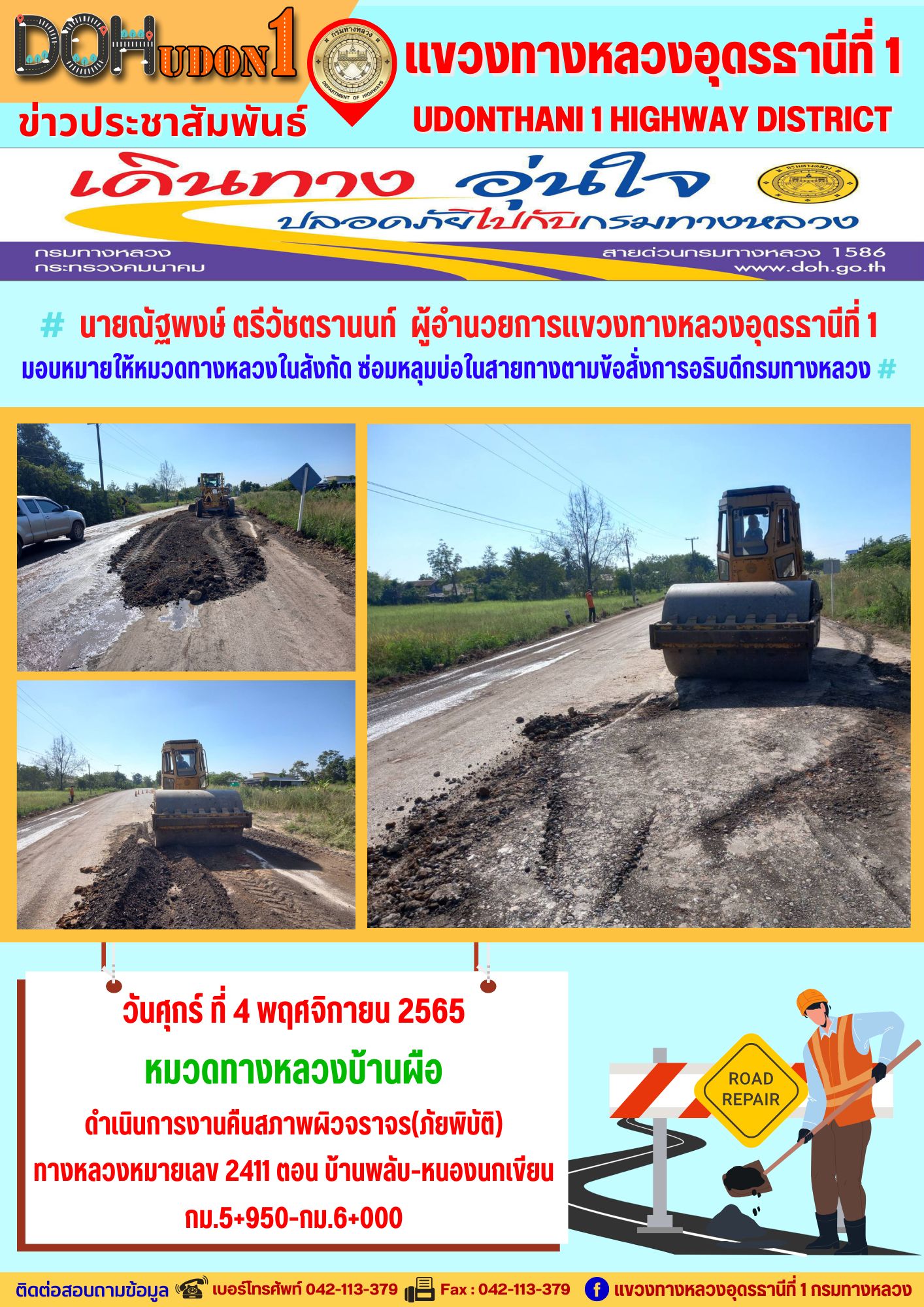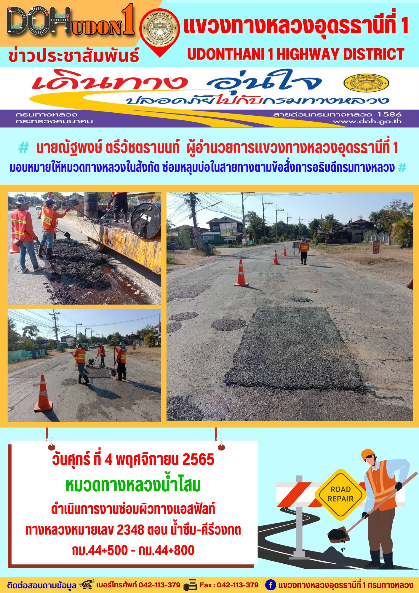 นายณัฐพงษ์ ตรีวัชตรานนท์ ผู้อำนวยการแขวงทางหลวงอุดรธานีที่ 1 มอบหมายให้หมวดทางหลวงในสังกัด ซ่อมหลุมบ่อในสายทางตามข้อสั่งการอธิบดีกรมทางหลวง