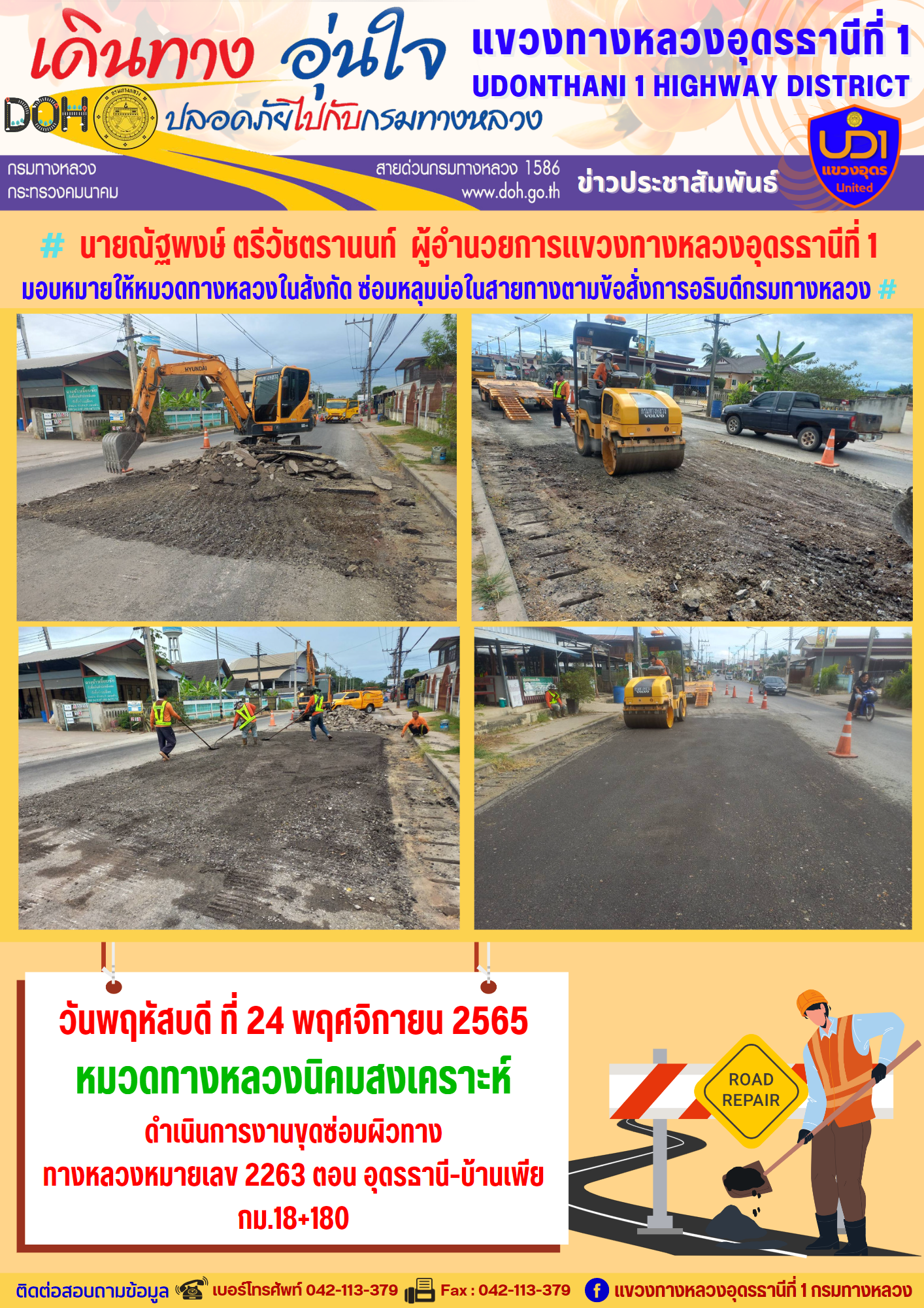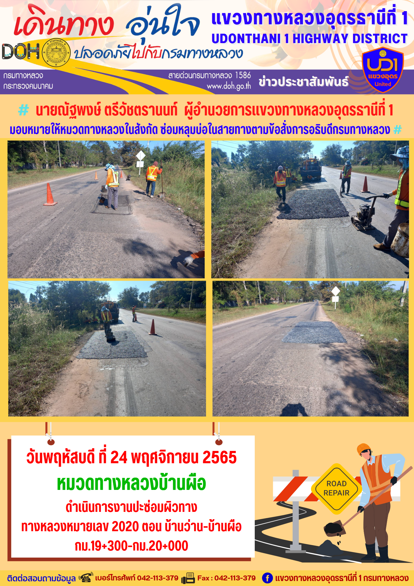 นายณัฐพงษ์ ตรีวัชตรานนท์ ผู้อำนวยการแขวงทางหลวงอุดรธานีที่ 1 มอบหมายให้หมวดทางหลวงในสังกัด ซ่อมหลุมบ่อในสายทางตามข้อสั่งการอธิบดีกรมทางหลวง