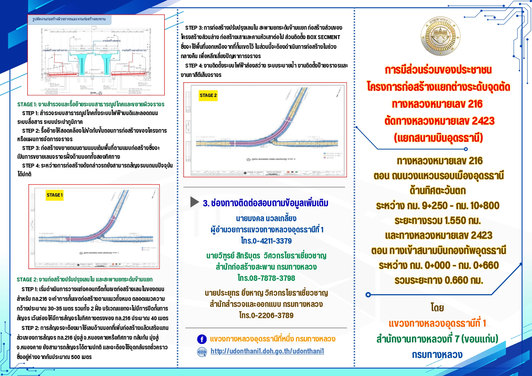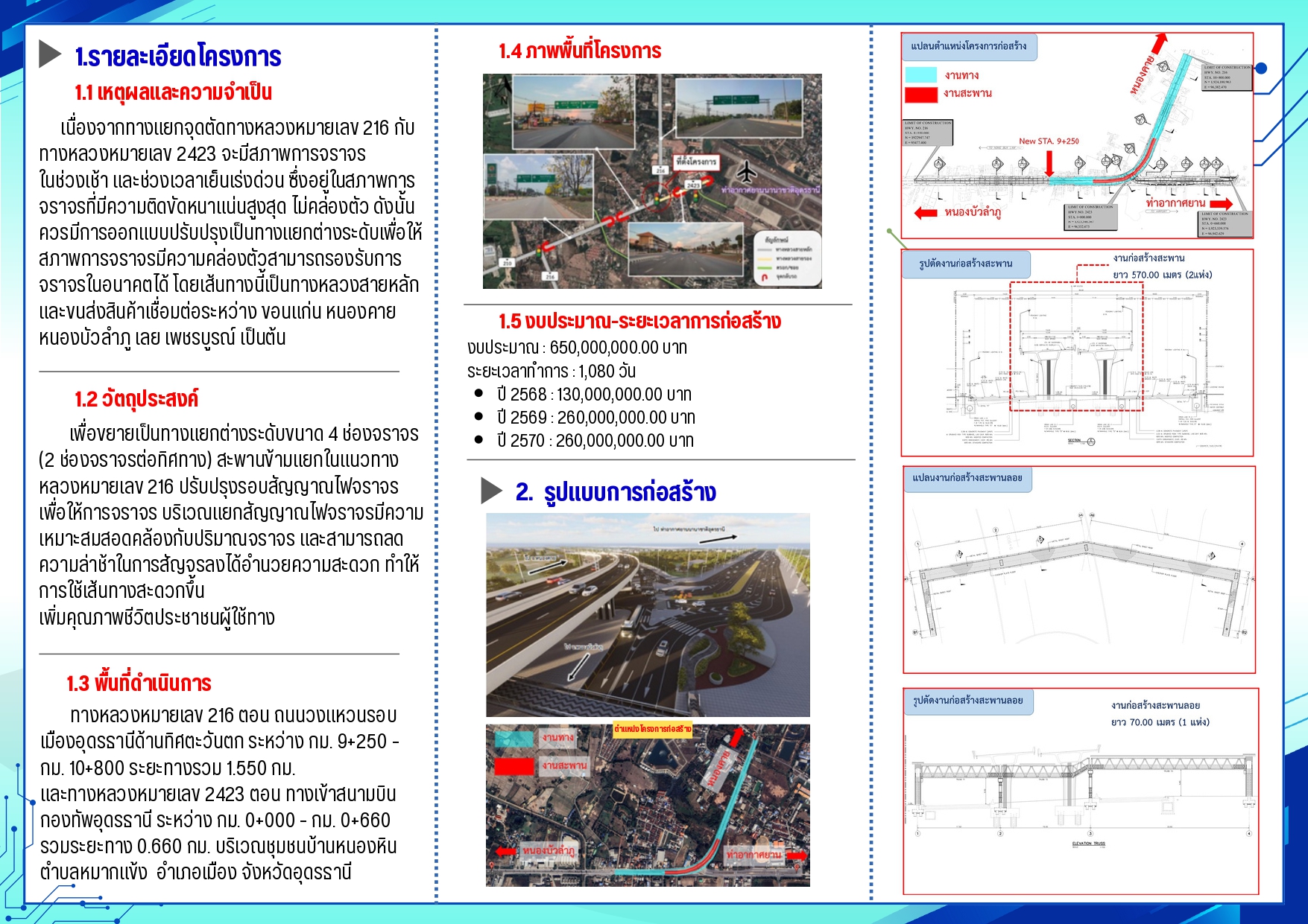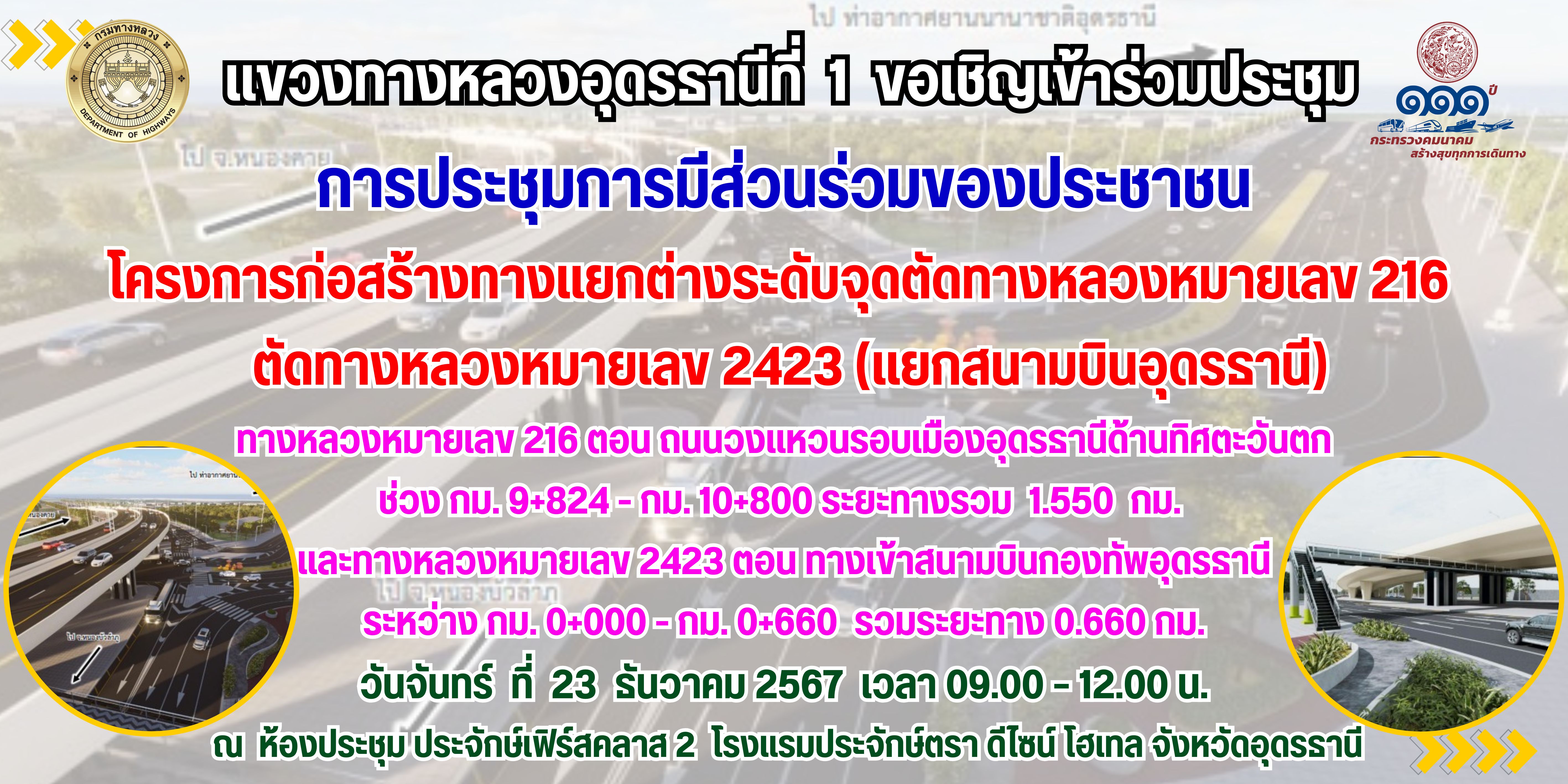 แขวงทางหลวงอุดรธานีที่ 1 ขอเชิญประชาชนทุกท่านเข้าร่วมประชุม โครงการประชุมการมีส่วนร่วมของประชาชน โครงการก่อสร้างทางแยกต่างระดับจุดตัดทางหลวงหมายเลข 216 ตัดทางหลวงหมายเลข 2423 (แยกสนามบินอุดรธานี) ทางหลวงหมายเลข 216 ตอน ถนนวงแหวนรอบเมืองอุดรธานีด้านทิศตะวันตก ช่วง กม. 9+824 - กม. 10+800 ระยะทางรวม 1.550 กม. และทางหลวงหมายเลข 2423 ตอน ทางเข้าสนามบินกองทัพอุดรธานี ระหว่าง กม. 0+000 - กม. 0+660 รวมระยะทาง 0.660 กม. วันจันทร์ ที่ 23 ธันวาคม 2567 เวลา 09.00 – 12.00 น. ณ ห้องประชุมประจักษ์เฟิร์สคลาส 2 โรงแรมประจักษ์ตรา ดีไซน์ โฮเทล จังหวัดอุดรธานี