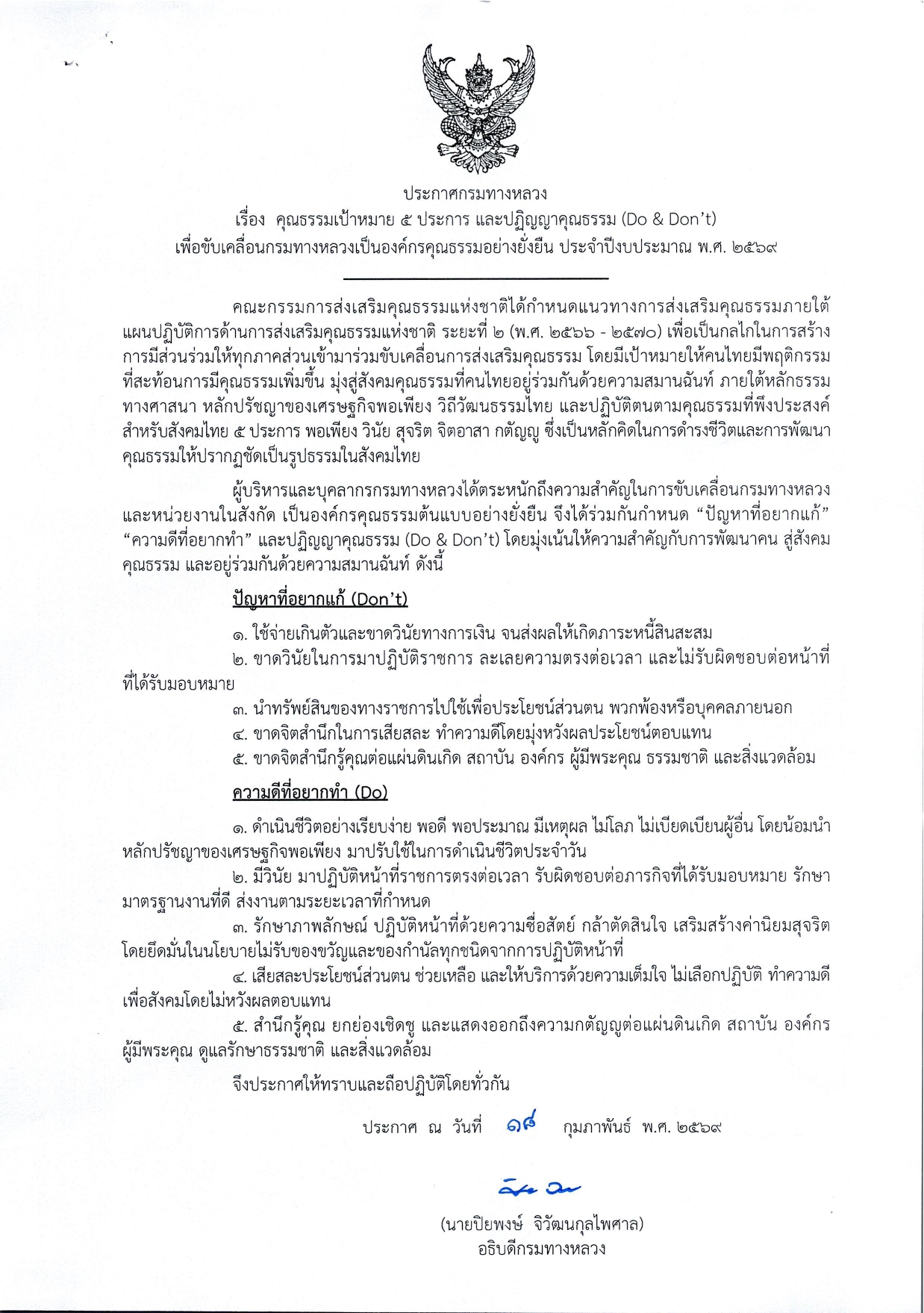เรื่อง คุณธรรมเป้าหมาย 5 ประการ และปฏิญญาคุณธรรม (Do & Don't) เพื่อขับเคลื่อนกรมทางหลวงเป็นองค์กรคุณธรรมอย่างยั่งยืน ประจําปีงบประมาณ พ.ศ. 2569